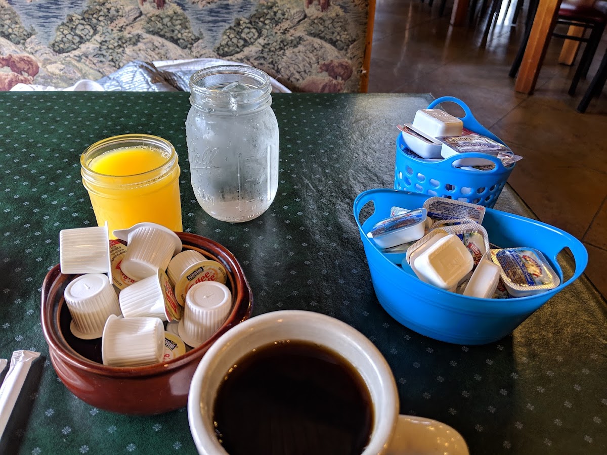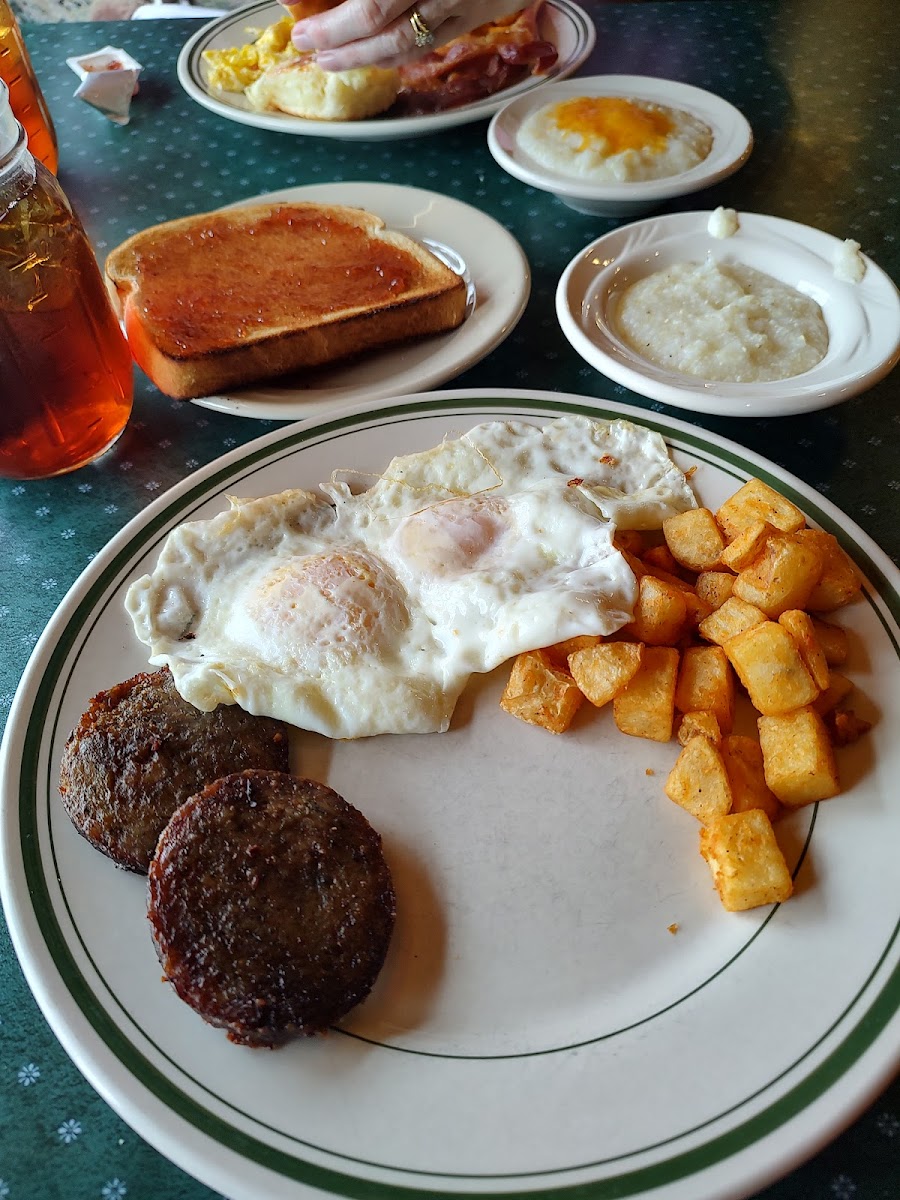 Hillbilly's Special Two Eggs Sausage Grits Taters Sourdough Toast and Great Sweet Tea